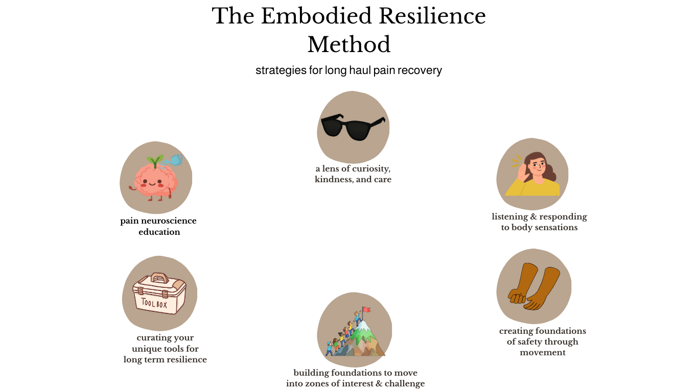The Embodied Resilience Method utilizes somatic, biomechanical, and cognitive strategies to reconnect to body signals and re-establish a lived experience of safety, thus minimizing pain cycles and increasing long term physical and psychological resilience.